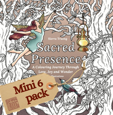 Sacred Presence: A Colouring Journey through Love, Joy and Wonder features 40 hand-drawn illustrations of whimsical, fantasy-inspired scenes, including fairies, forests, flowers, trees, and magical creatures.
